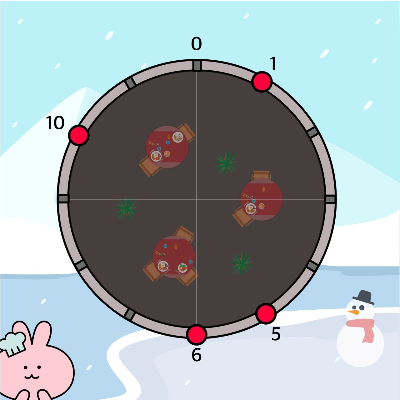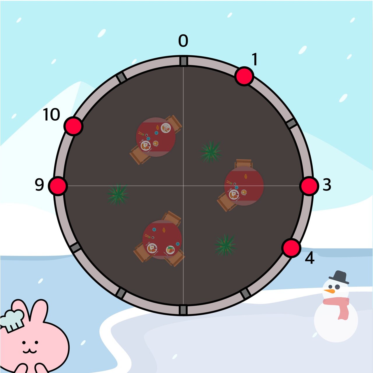 원형 레스토랑에서 외벽의 취약 지점의 위치는 다음과 같습니다.