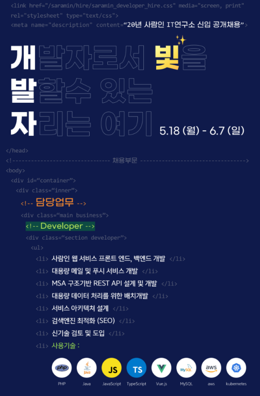 - 예시로 사람인 개발자 공채 공고를 가져왔습니다.